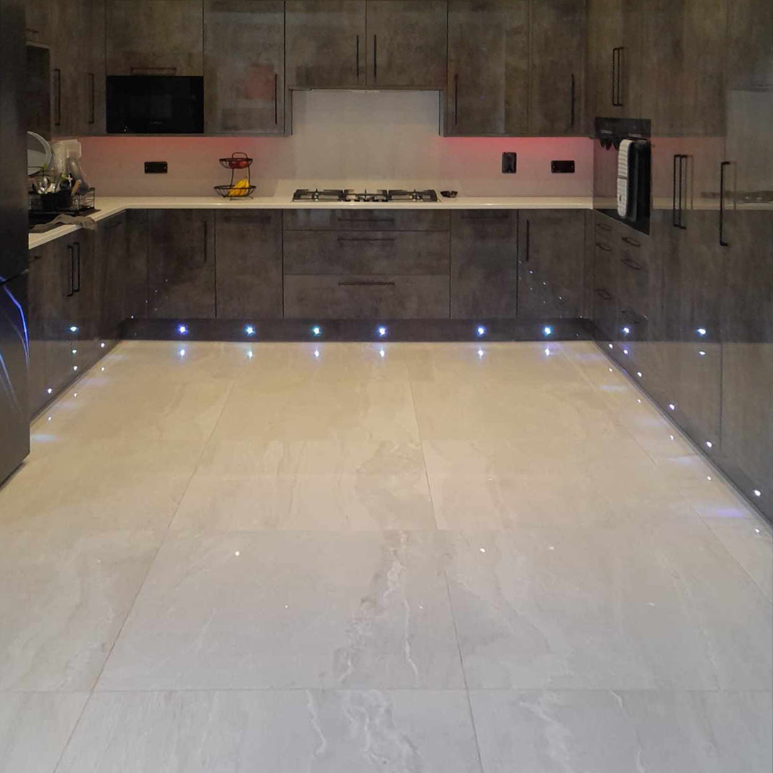 This project showcases a modern, minimal kitchen design brought to life with sleek grey marble unit doors and drawers. The unique marble pattern adds a sophisticated touch, perfectly balancing elegance and functionality. To complement the cabinetry, we installed high-quality, durable tiles, creating a seamless and practical finish for the kitchen floor and splashback areas.